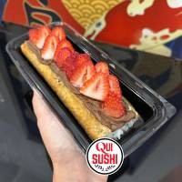Hot frito inteiro, recheado com arroz japonês e cream cheese, depois aberto ao meio e recheado com chocolate cremoso e morangos fresco. *Não acompanha molhos*