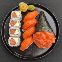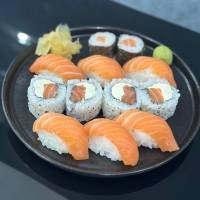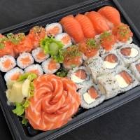 4 sashimi de salmão, 4 uramaki salmão filadélfia, 4 niguiri salmão, 3 sushi Joe. *Acompanha: wasabi, gengibre, molho shoyu, 2 pares de hashi.*