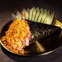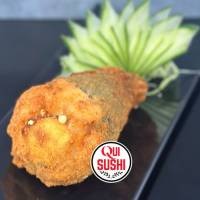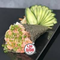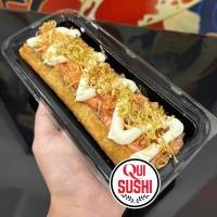 Hot frito inteiro, recheado com arroz japonês e cream cheese, depois aberto ao meio e recheado com 100g de salmão fresco em cubos, finalizado com cream cheese e crispy de couve manteiga. Acompanha: 1 potinho de molho tarê e 3 sachês de molho shoyu premium.