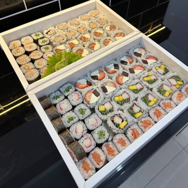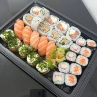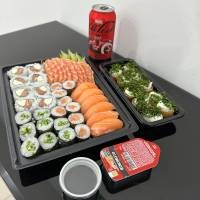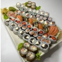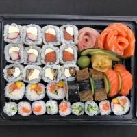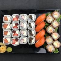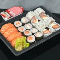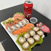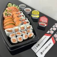 8 sashimi de salmão, 8 uramaki salmão filadélfia, 8 hossomaki shake, 4 uramaki Maki Joe, 4 niguiri salmão, 3 Sushi Joe. *Acompanha: wasabi, gengibre, molho shoyu, 3 pares de hashi.*