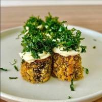 6 unidades - Salmão enrolado no arroz, coberto com cream cheese e crispy de couve manteiga.