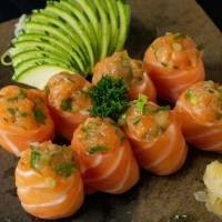10 unidades - Recheado com arroz, salmão e cream cheese, envolto com fatias de salmão maçaricado.