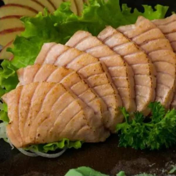 5 fatias de salmão maçaricado.
