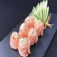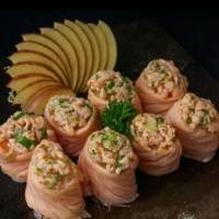 10 unidades - Recheado com salmão, cream cheese e arroz, envolto com fatias de salmão.
