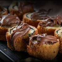 8 unidades - Sushi frito, recheado com banana, coberto com chocolate cremoso. Não acompanha molho!