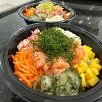 200g de arroz japonês com gergelim e cebolinha |100g de salmão cortado em cubos | manga | cebola roxa | kani em cubos | gengibre | sonomono | pepino agridoce | acompanha: molho shoyu, molho tarê e 1 par de hashi | *Exatamente como na imagem*