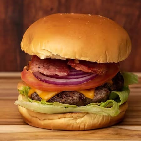 Delicioso Burger Artesanal assado na brasa (carvão), temperado com sal de parrilha e um leve toque de pimenta do reino. + cheddar duplo, alface, tomate, cebola roxa e bacon no pão brioche.