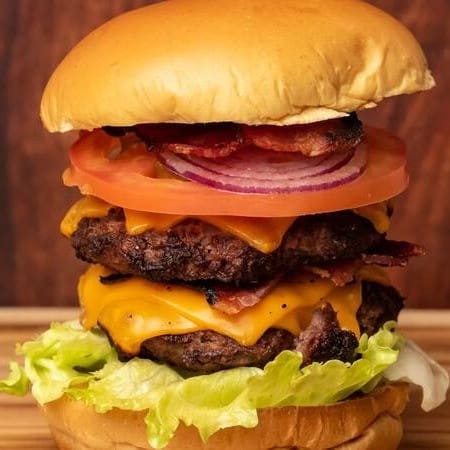 Esse é o nosso maior burger! Pesando por volta de 1/2 quilo :) 2 Burgers Artesanais Da Casa Queijo Cheddar, Alface, Tomate, Cebola Roxa e Bacon