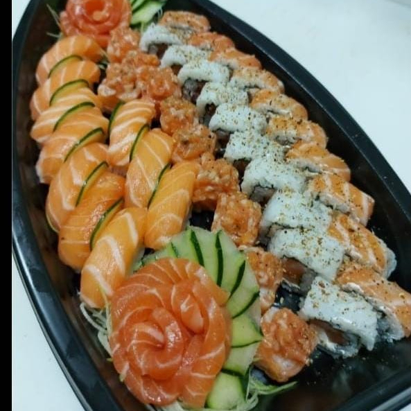 10 uramakis filadelfia, 5 sashimis de salmão, 5 sashimis de tilapia, 3 niguiris de salmao, 3 niguiris de tilapia, 4 kapa makis, 4 shake makis, 5 uramakis romeu e julieta, 4 uramakis de kani selado e 2 joes.