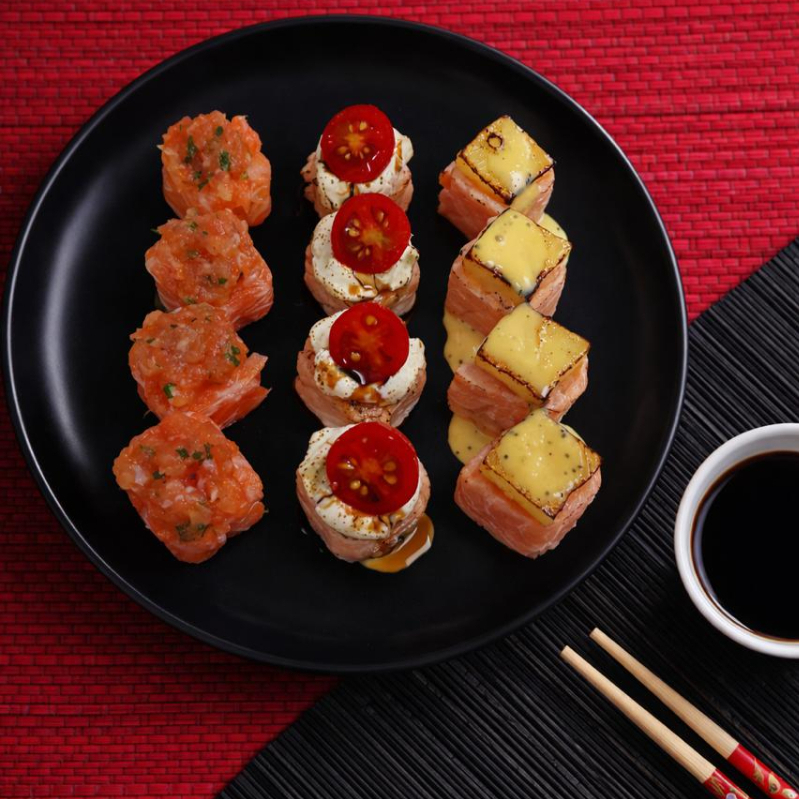 9 uramaki filadelfia , 6 niguiris de salmão , 5 sashimi de salmão , 2 pastel de salmão cremoso
