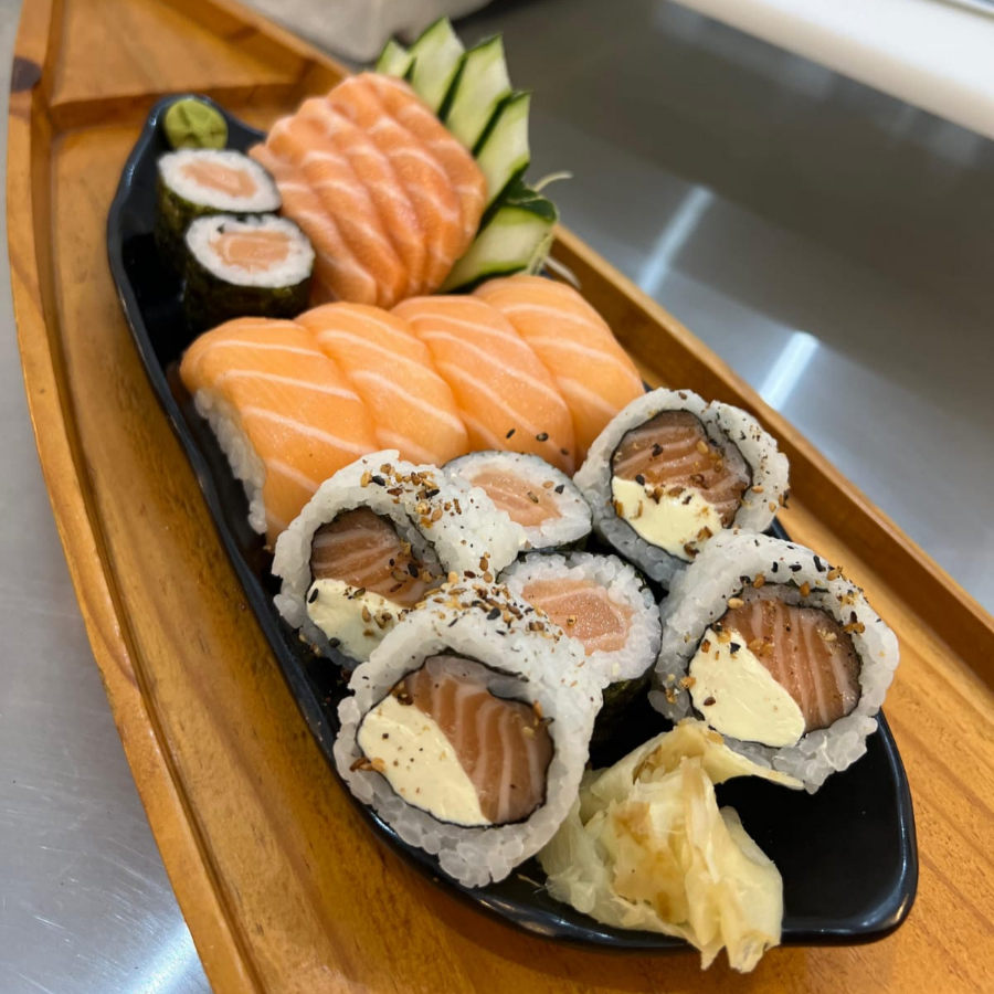 5 sashimi de salmão , 4 uramaki filadelfia ,4 shake maki ,4 niguiri salmão , 5 romeu e julieta