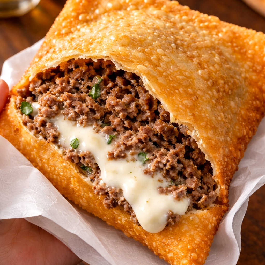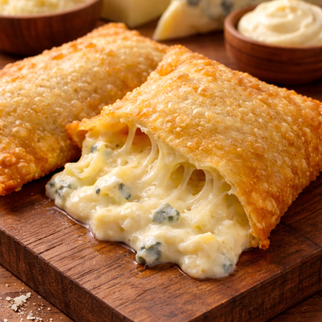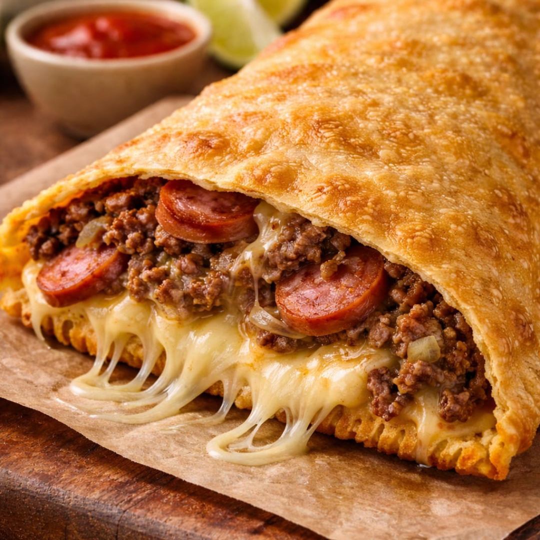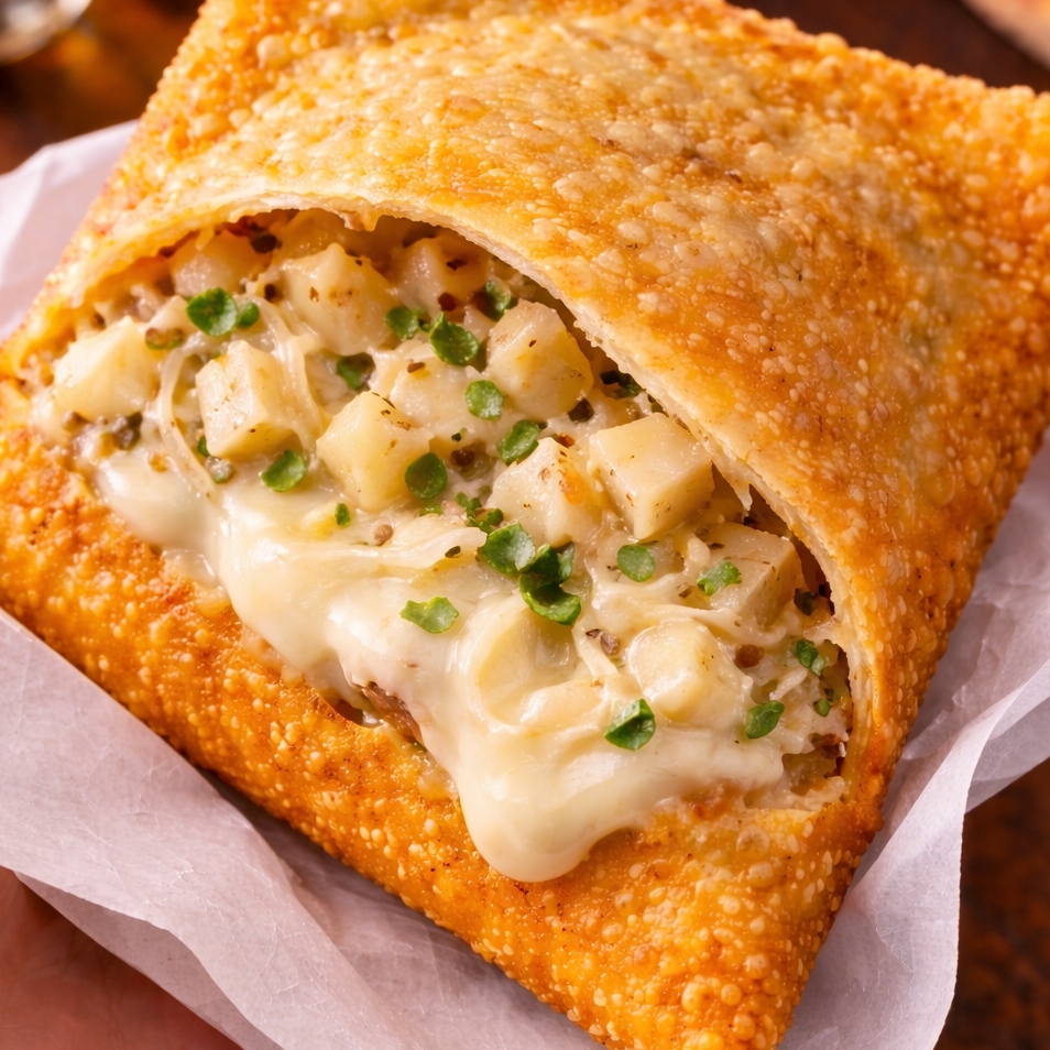 Recheio de queijo, presunto e orégano em um pastel crocante. Um clássico reinventado.