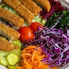 Uma combinação colorida e nutritiva: alface crocante, beterraba ralada, couve, cenoura fresca, tomate, cebola roxa, picles e repolho roxo. Para completar, você escolhe sua proteína preferida: frango empanado vegetal, hambúrguer vegetal grelhado, almôndegas, kibe, vegnuggets ou iscas de peixe vegetal. Uma refeição leve, saborosa e 100% vegetal!