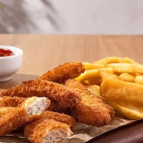 Delicie-se com nossas tiras crocantes e empanadas, saborosas como peixe, acompanhadas de nossas fritas irresistíveis. 100% vegetal!