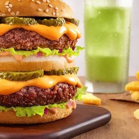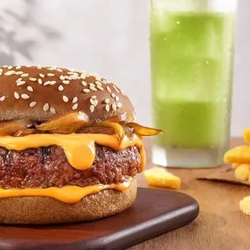 O irresistível Bigveg, acrescido de um acomphamento e uma refrescante bebida à sua escolha e com desconto. 100% vegetal, 200% sabor!