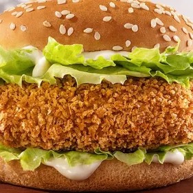 Delicioso burger sabor frango empanado e dourado (110g) com maionese suave e cremosa, acompanhado de alface crocante e orgânica num pão fofinho com gergelim. 100% vegetal! (proteína de soja, ervilha e grão de bico. Empanada com farinha de milho) *contém alho e cebola