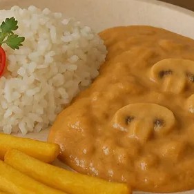 Desfrute do nosso irresistível Strogonoff de Planta, 100% vegetal sabor frango, acompanhado por arroz branco ou integral, e ainda opte entre um delicioso purê de batata cremoso ou batatas fritas. Uma combinação perfeita para o seu almoço!