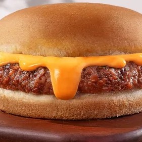 Pão fofinho, burger de planta grelhado (115g) com queijo delicioso de plantas cremoso sabor cheddar! 100% Vegetal!