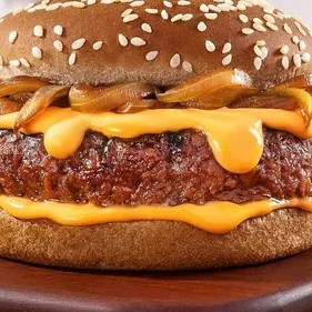 Pão fofinho com gergelim, burger de plantas (115g), delicioso queijo de plantas cremoso sabor cheddar e para completar: cebola caramelizada, orgânica e chapeada. 100% vegetal!
