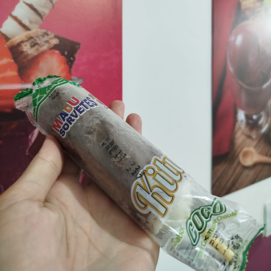 Delicioso sorvete sabor Coco com casquinha de chocolate ao leite