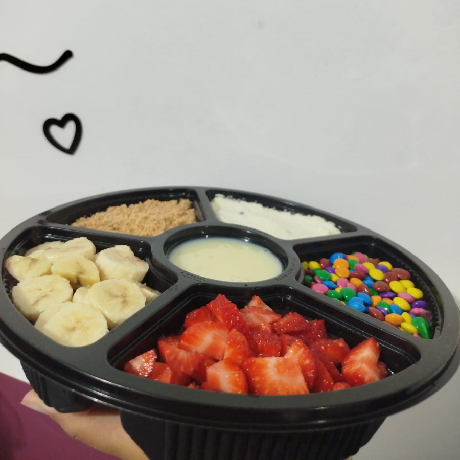 Nessa opção você pode escolher 6 complementos, vai uma camada com açaí e no topo vai os itens escolhidos. OBS: Apenas o meio não vai com açaí (Círculo) as demais cavidades vão todas :)
