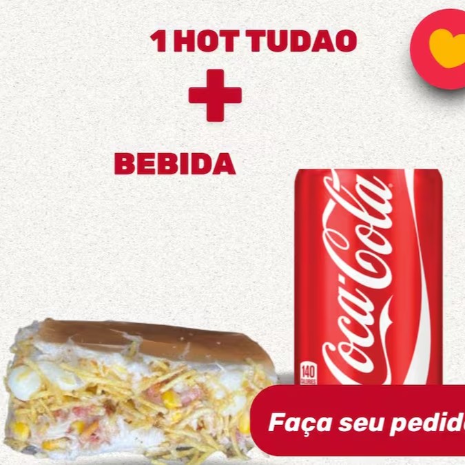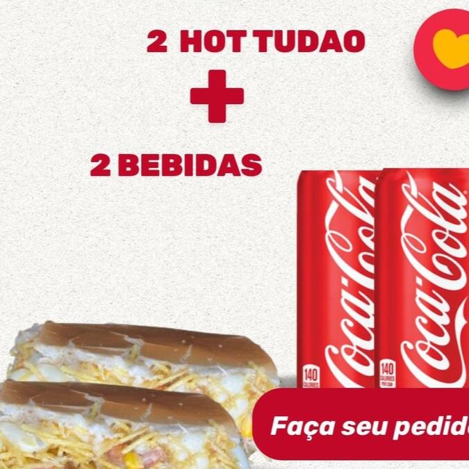 O Hot Tudão é o lanche perfeito para matar a sua fome ,e para completar, você ainda escolhe uma lata de Coca-Cola ou Guaraná.