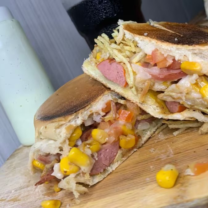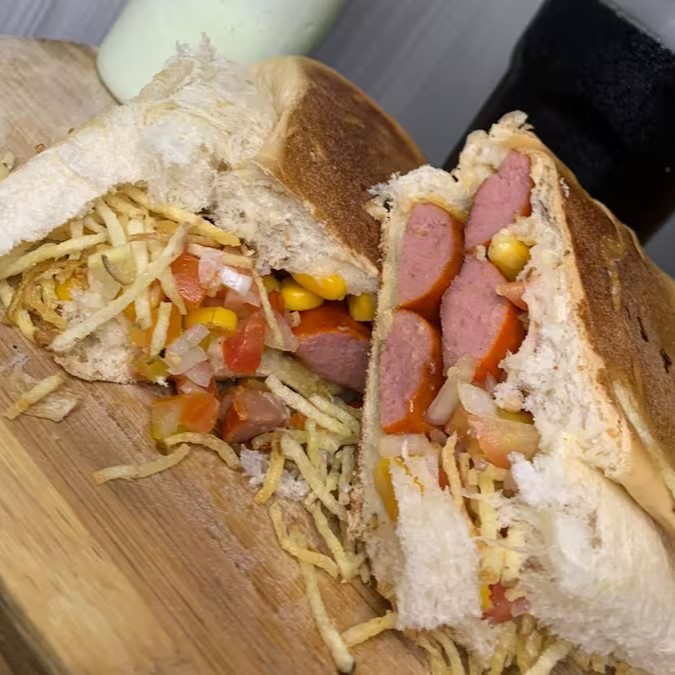Pão, vina, calabresa, vinagrete, milho, batata palha e maionese da casa (Catupiry ou cheddar).