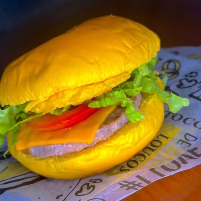 Pão brioche, hambúrguer 56g, queijo cheddar, alface, tomate e molho da casa.