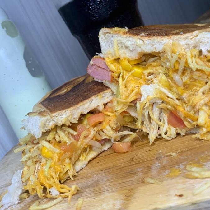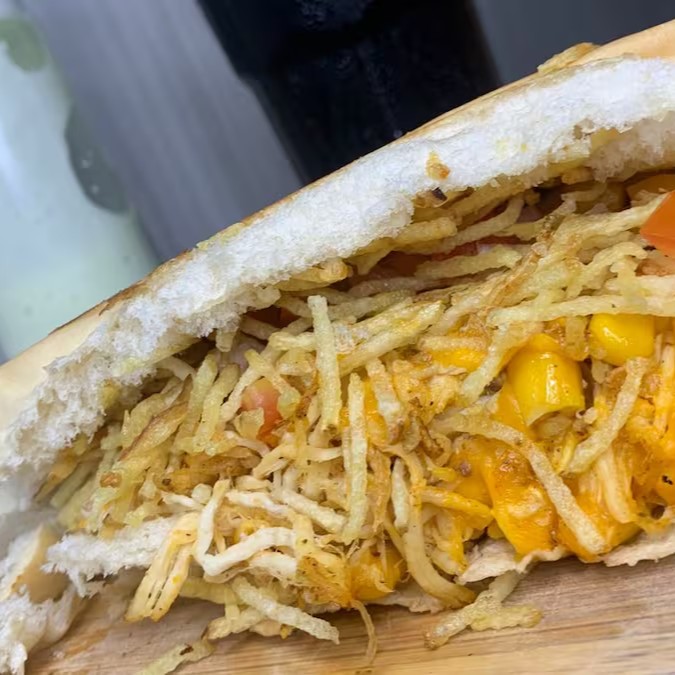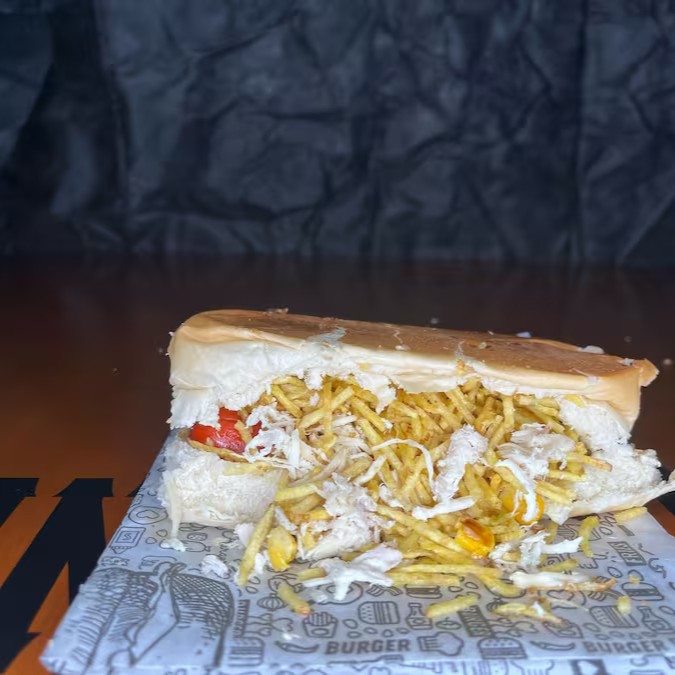 Pão,vina,frango,vinagrete,milho,batata palha,pure de batatas e maionese da casa (Catupiry ou cheddar).