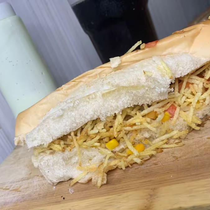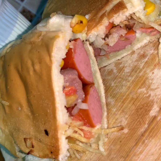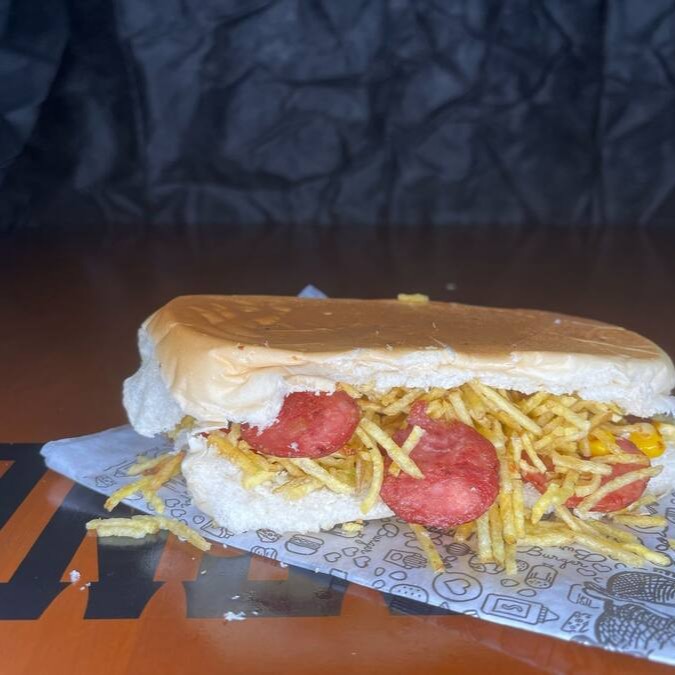 Pão,vina,calabresa,vinagrete,milho,batata palha,pure de batatas e maionese da casa (Catupiry ou cheddar).