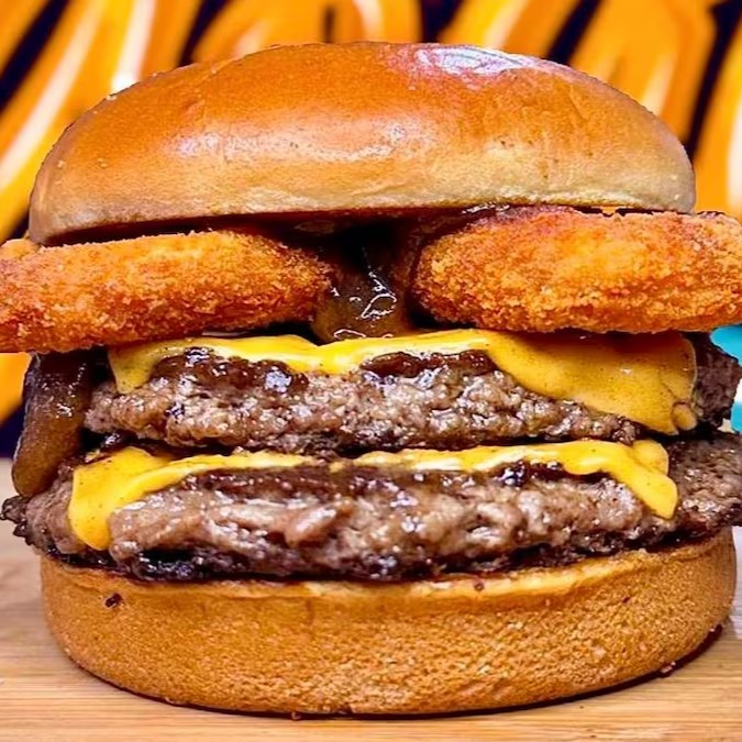 Pão de brioche, 2x smash de 80g, queijo cheddar, 3 aneis de cebola e molho barbecue.