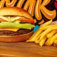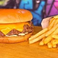 pão de brioche, hamburguer de 120g, queijo cheddar, molho da casa e batata frita