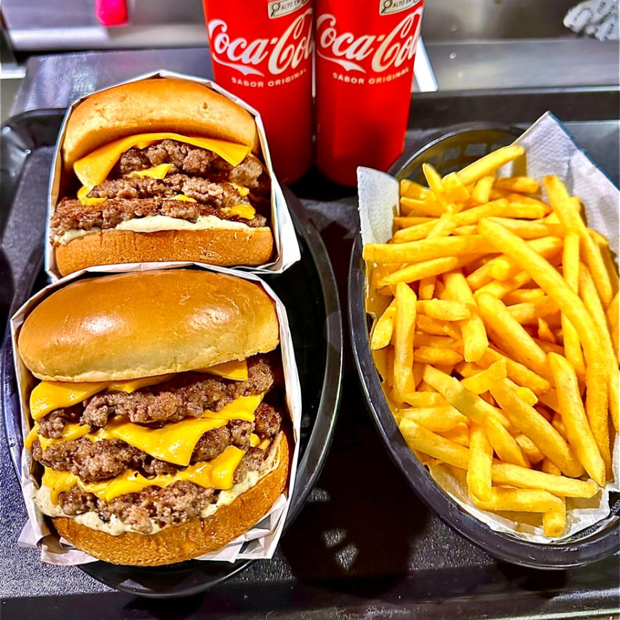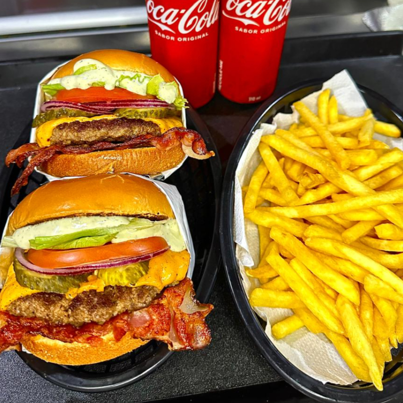 2x lanche, Pão de brioche, 3 samsh de 80g, queijo cheddar, molho da casa, 2x batata mais 2x coca cola 310ml.