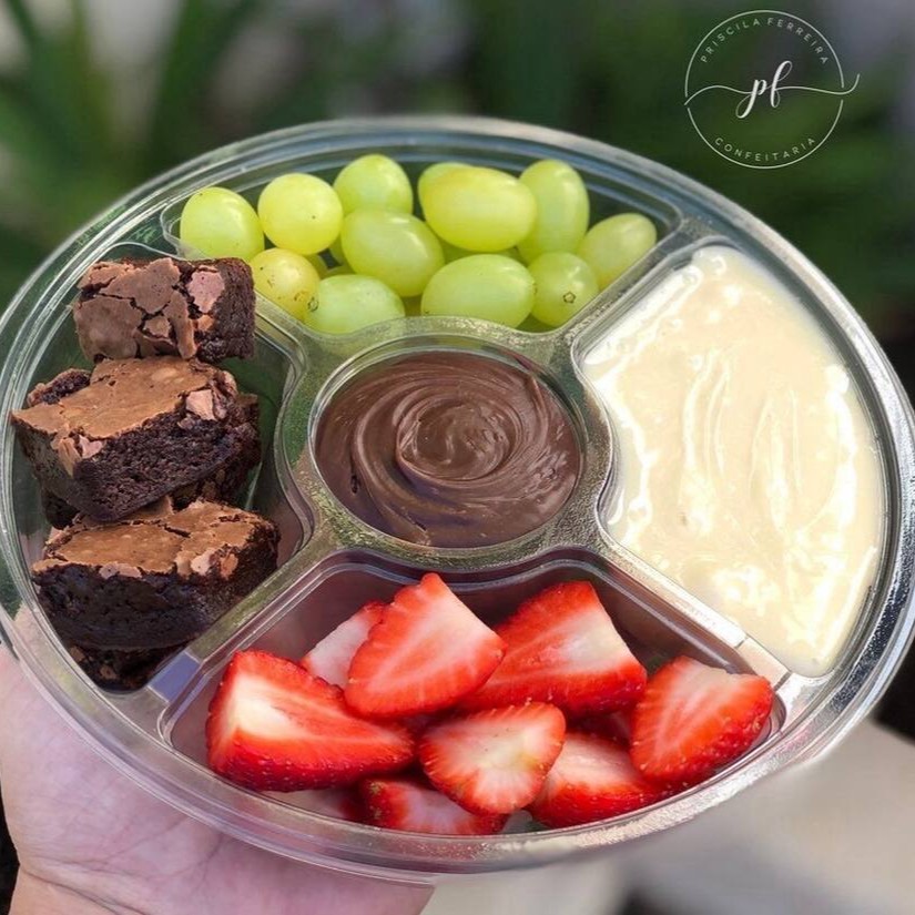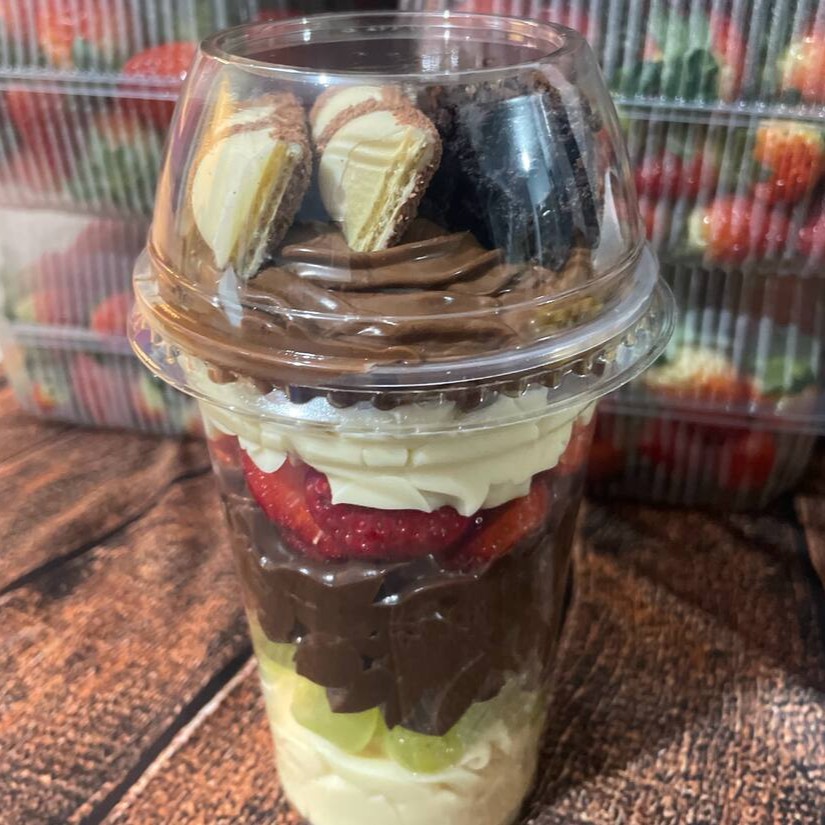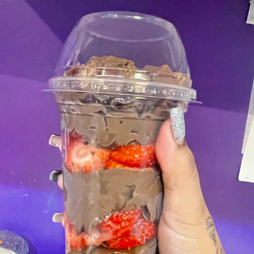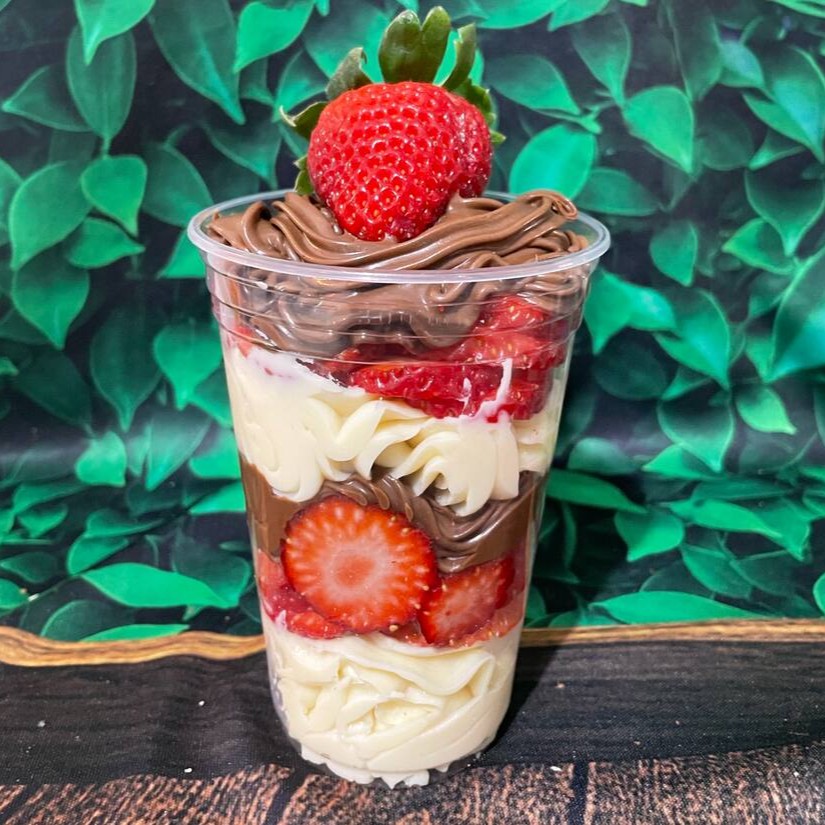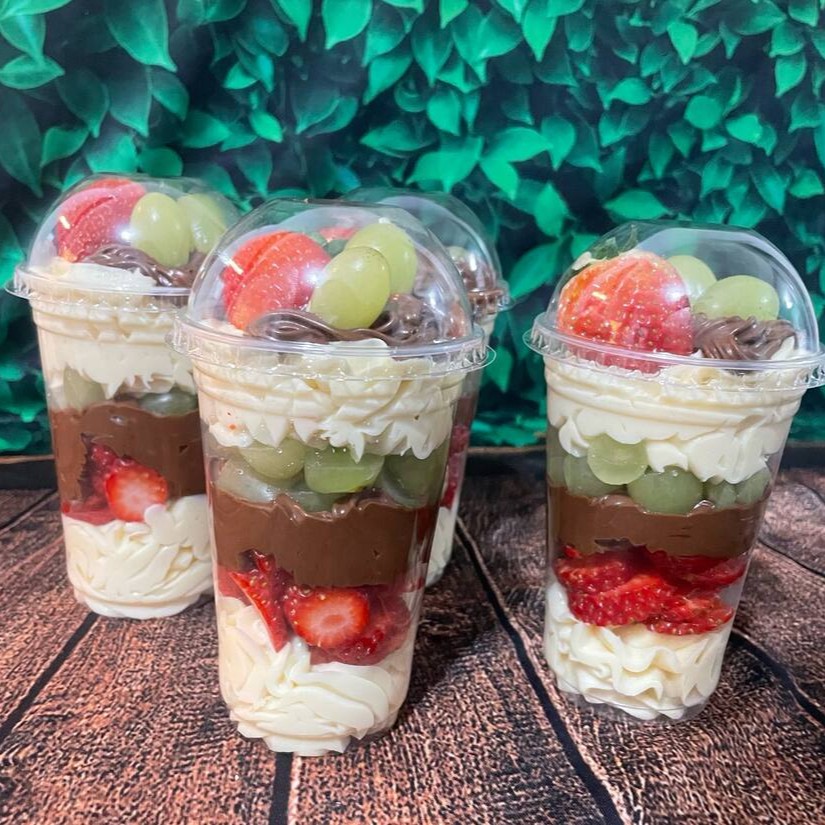 Copo brownie, morango, uva, creme Ninho, creme de chocolate e Nutella