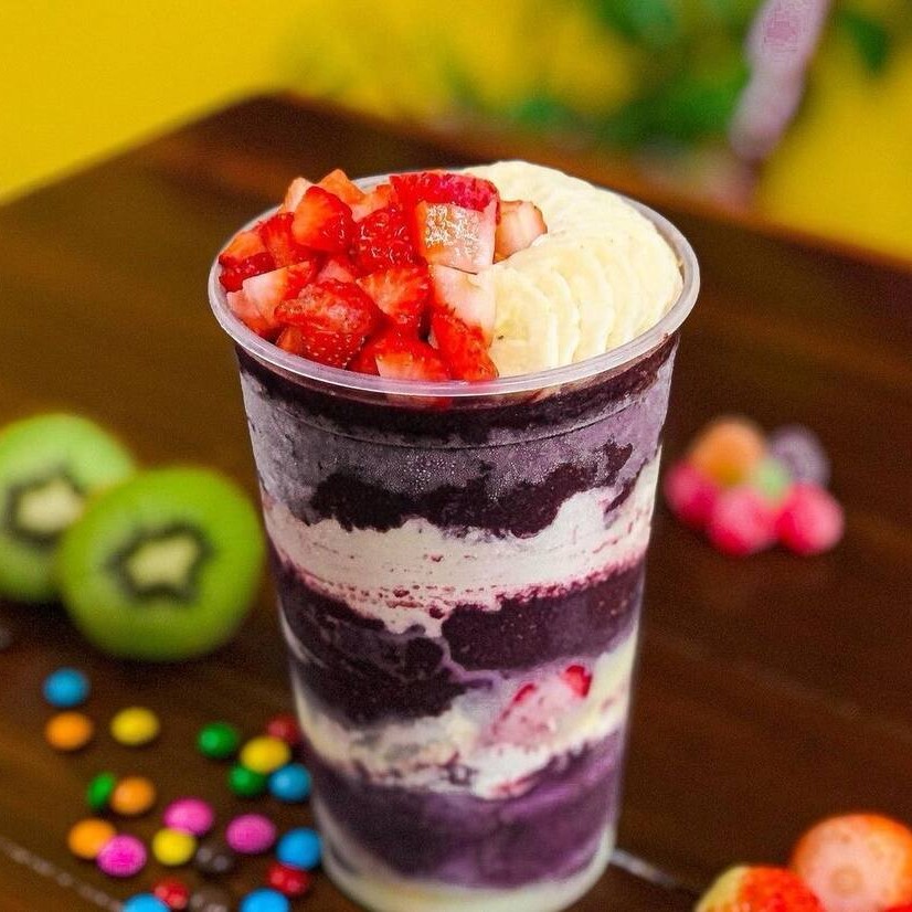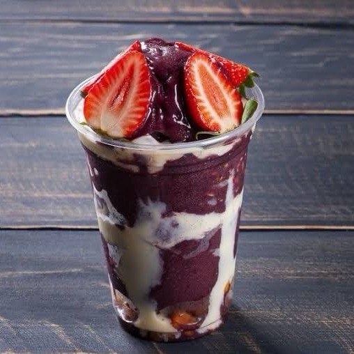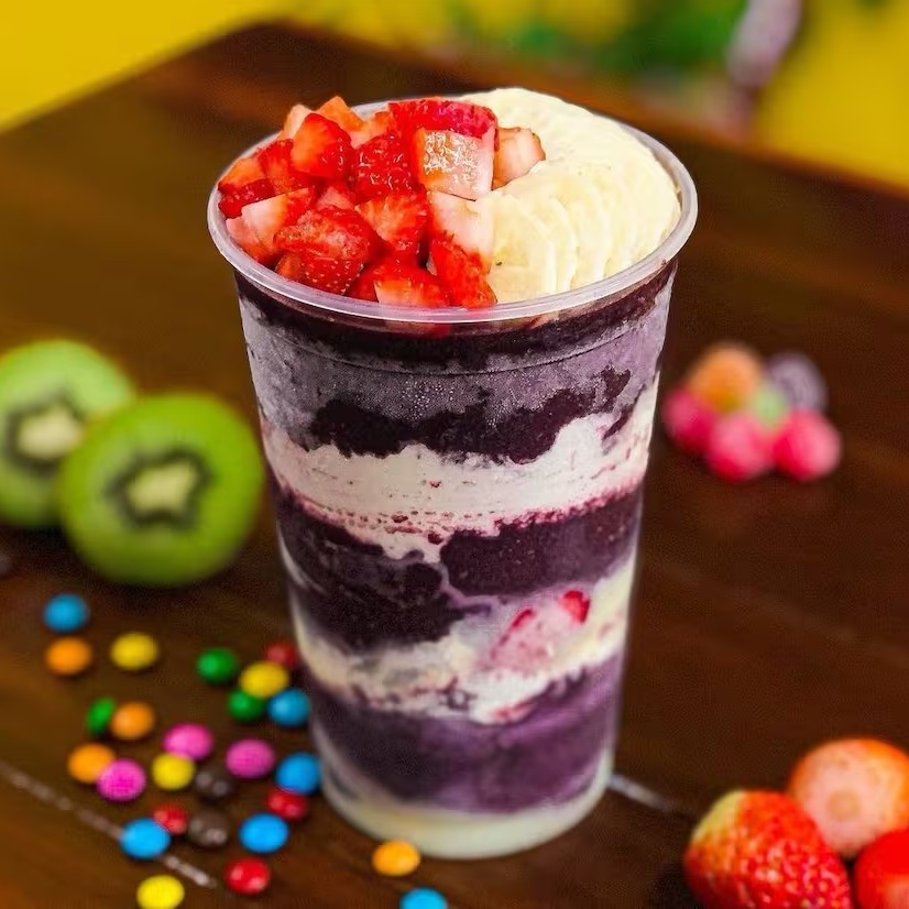 Açaí cremoso combinado com leite condensado, leite em pó e morangos fresquinhos. Uma mistura doce, suave e refrescante que conquista no primeiro pedaço!