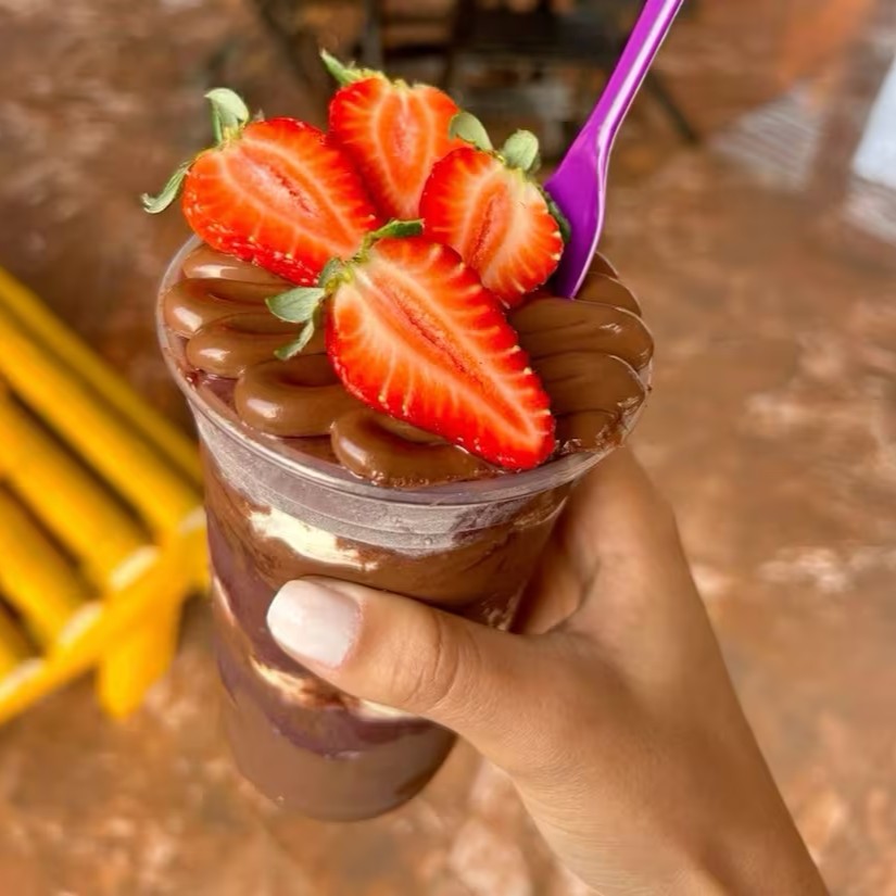“Açaí trufado irresistível, coberto com creme de avelã cremoso, leite condensado, leite em pó e morangos fresquinhos. Uma explosão de sabores para adoçar seu Dia!”
