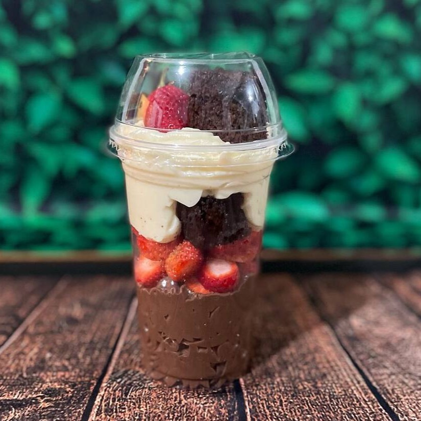 Copo da felicidade contendo brownie, creme de Ninho, creme de chocolate e morango