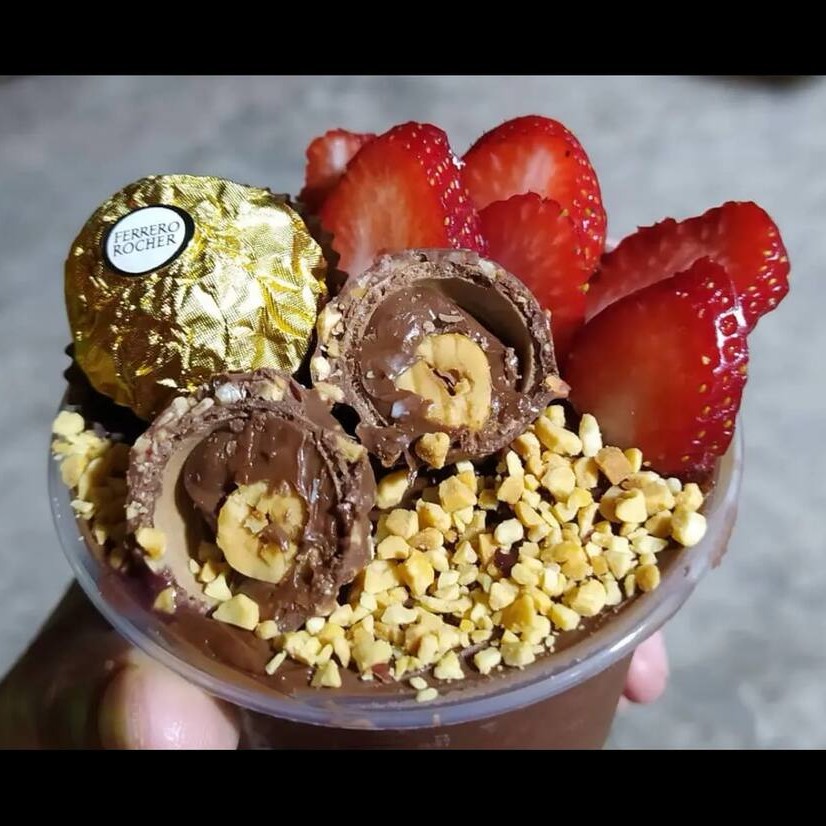 Uma combinação irresistível de açaí cremoso com leite condensado, creme de avelã, pedaços de morango fresquinho, crocância do amendoim e o sabor inconfundível do Ferrero Rocher. Uma explosão de sabor em cada colherada!
