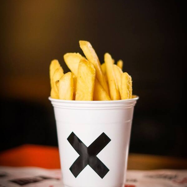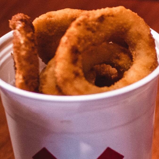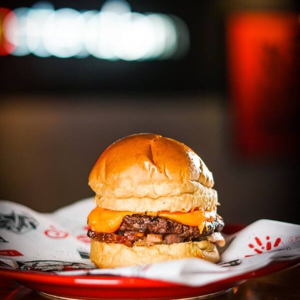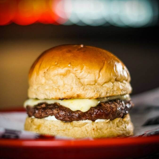 120g de burger, pão, duas fatias de queijo, maionese da casa, barbecue e cebola roxa caramelizada.