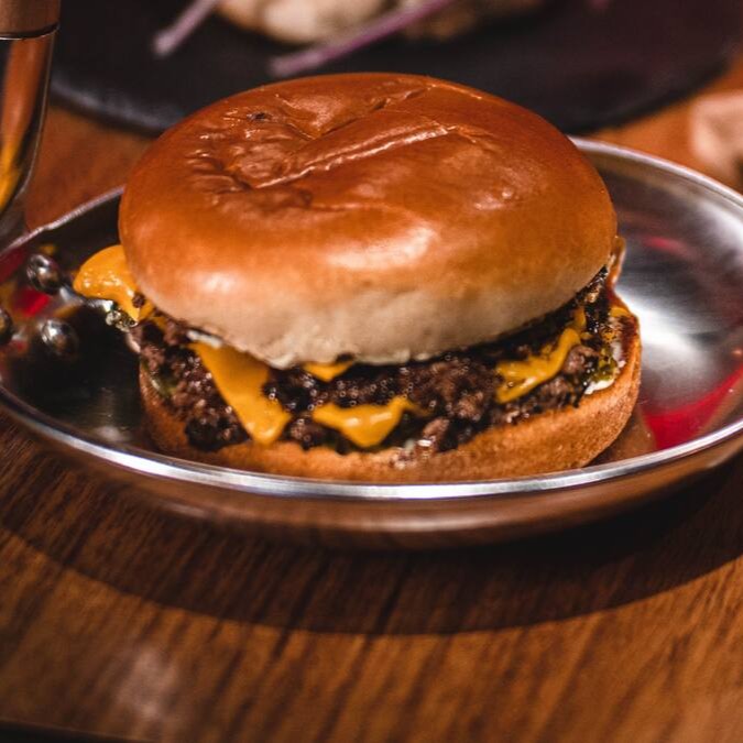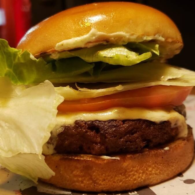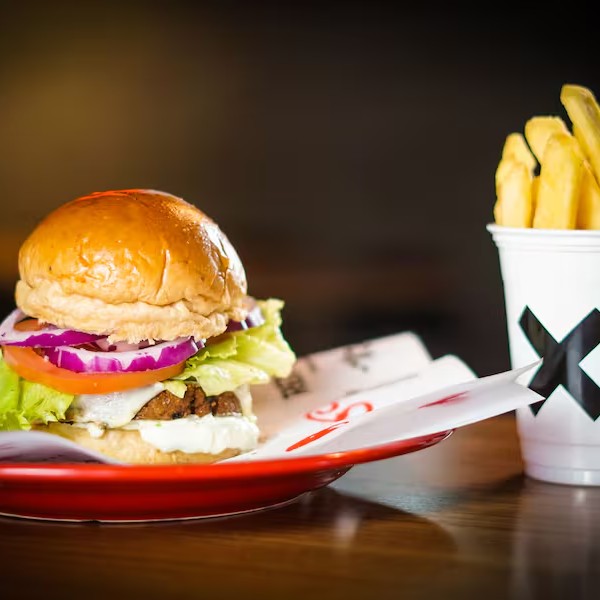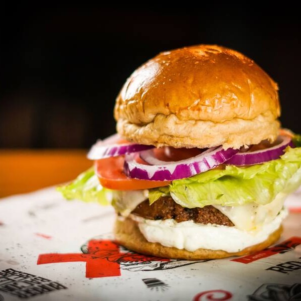 Pão Brioche, queijo, cebola roxa, alface, maionese da casa e Burger a base de plantas com textura e gosto similar ao de carne.
