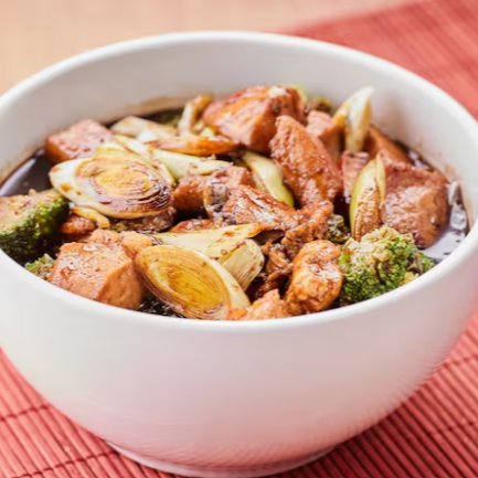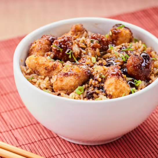 Cubos de frango grelhado com legumes coloridos salteados, mergulhados em um molho oriental irresistível e servidos com arroz yakimeshi, finalizado com amendoim. Uma explosão de cor e sabor!