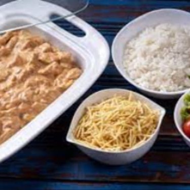 Deliciosa Marmita de Strogonoff de frango com tempero especial da casa, acompanha arroz branco e batata Palha.