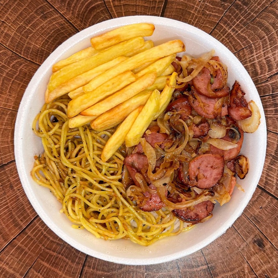 Deliciosa Marmita de Calabresa Acebolada feita na chapa na hora do seu pedido! Acompanha arroz, feijão e batata frita.