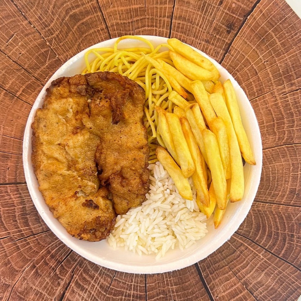 Delicioso Bife à Milanesa, acompanha arroz, feijão e batata frita.