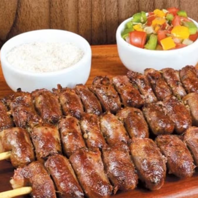 Deliciosos cubos de alcatra macios e suculentos com legumes (pimentão e cebola) grelhados na brasa.