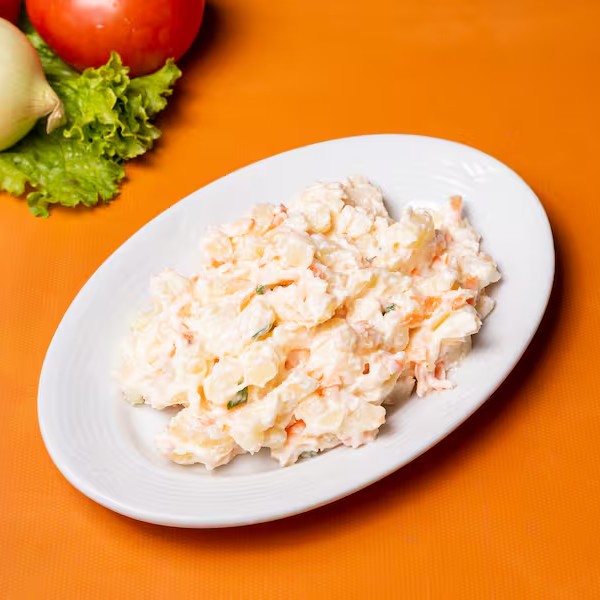 Acompanha uma porção de arroz, batata rústica, farofa de mandioca e maionese.