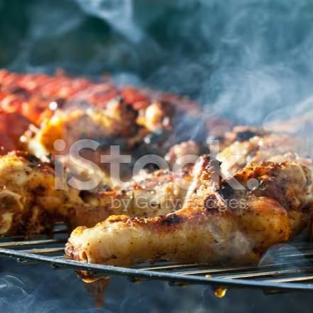 Deliciosos pedaços de coxa na brasa e sobre coxa.
