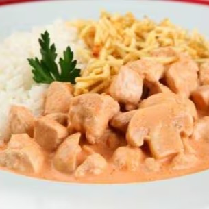 Delicioso estrogonofe de cubos de frango com arroz e batata palha.