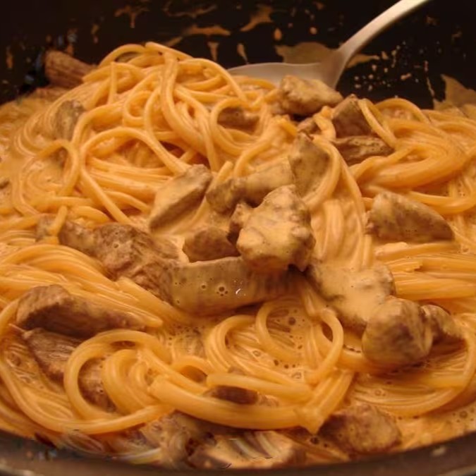 Delicioso espaguete fresco com estrogonofe de frango.