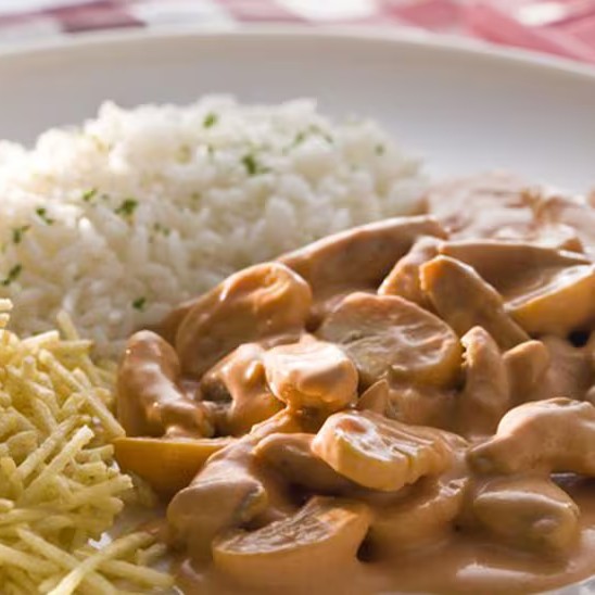 Delicia de estrogonofe para 3 pessoas, acompanha 400 gr de estrogonofe, arroz e batata palha.